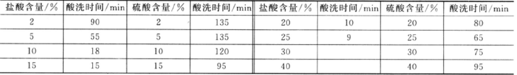 表4 钢铁工件在盐酸和硫酸中的酸洗时间与酸浓度的关系
