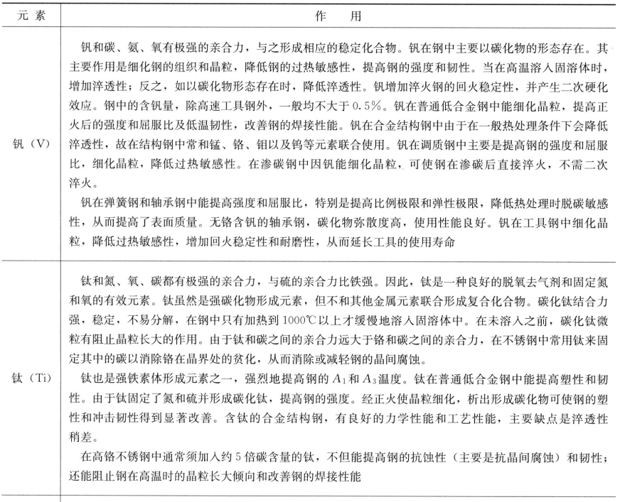 合金元素在钢中能够改变钢铁材料的使用性能和工艺性能 ,使钢铁材料能够得到更加优良的或特殊的性能。在使用性能方面,有高的强度和韧性的配合,或高的低温韧性,在高温下有高的蠕变强度、硬度及抗氧化性,或具有良好的耐腐蚀性。在工艺性能方面,有良好的热塑性、冷变形性、切削性、淬透性和焊接性等。这主要是合金元素加入后改变了钢和铁的内部组织。合金元素的加入产生了合金元素与铁、碳及合金元素之间的相互作用,改变了钢铁中各相的稳定性,并产生了许多新相,从而改变了原有的组织或形成新的组织。这些元素之间在原子结构、原子尺寸及晶体点阵之间的差异,则是产生这些变化的根源。